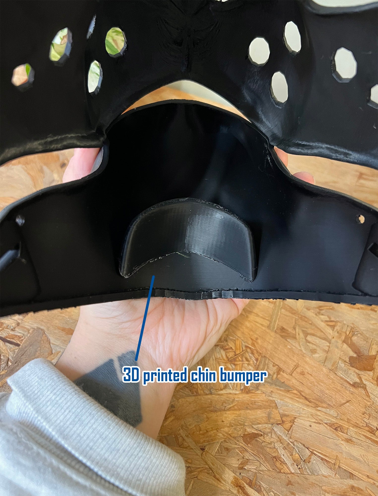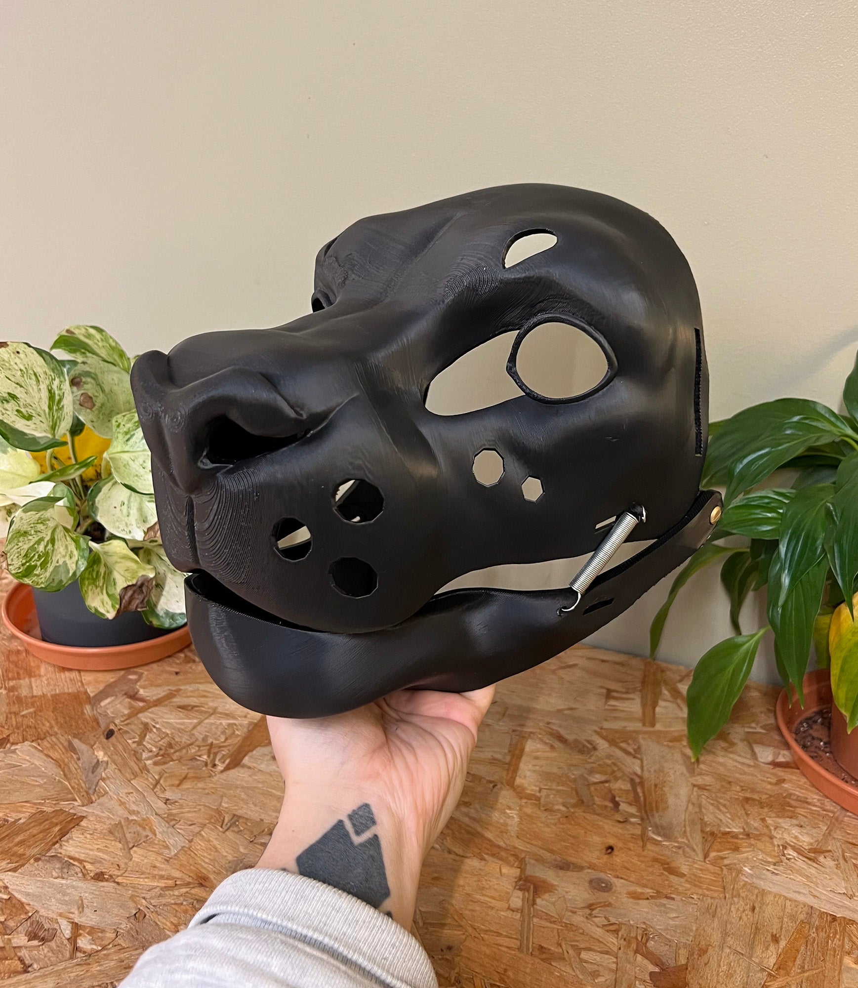 Printed in Toughened PLA, hinges are already built into the design, the head base arrives assembled via the hinge with removable rivets and will also include a set of springs. There is a slot in the spring area there, should you wish to use elastic instead (we do not provide elastic). There are three slots at the back for the attachment of straps as seen in the images. The eyelids are built into the base, and the gap next to them is the viewing port